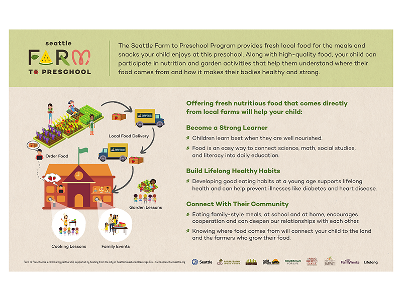 Download and print these materials to incorporate Farm to Preschool activities in the classroom or at home, to assist with purchasing seasonal foods, and to promote our program with families.